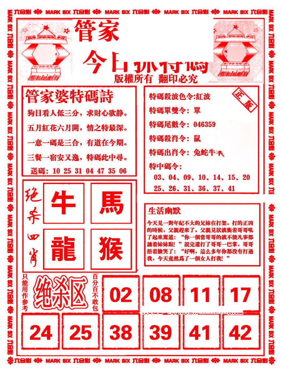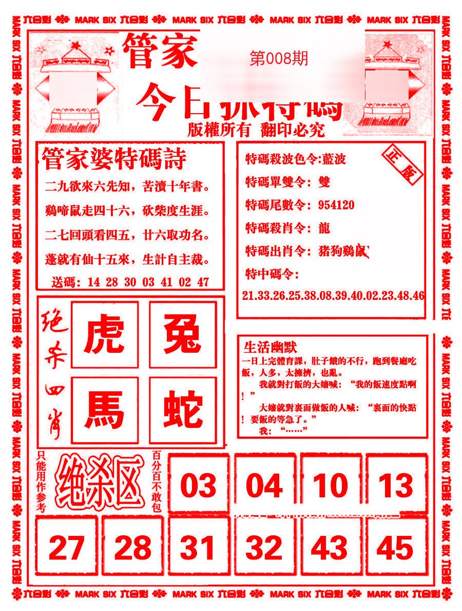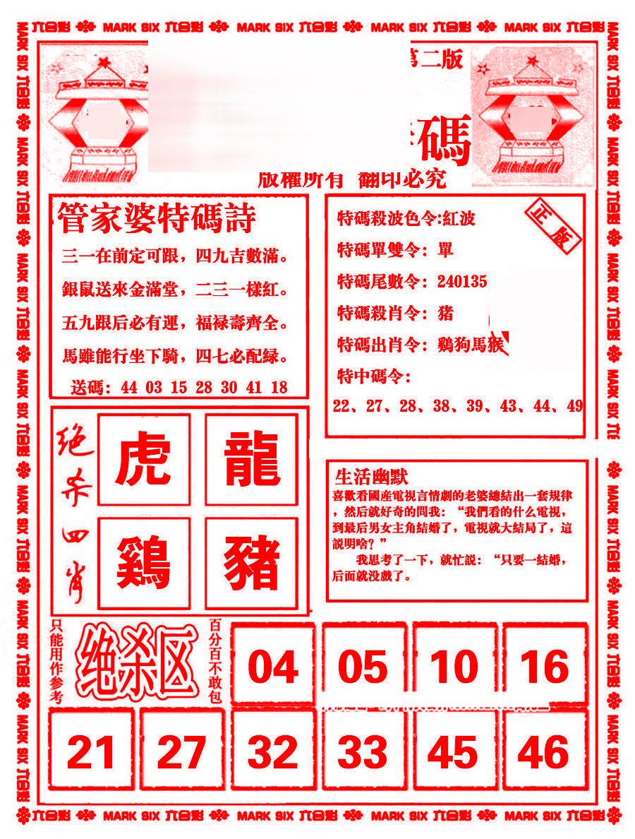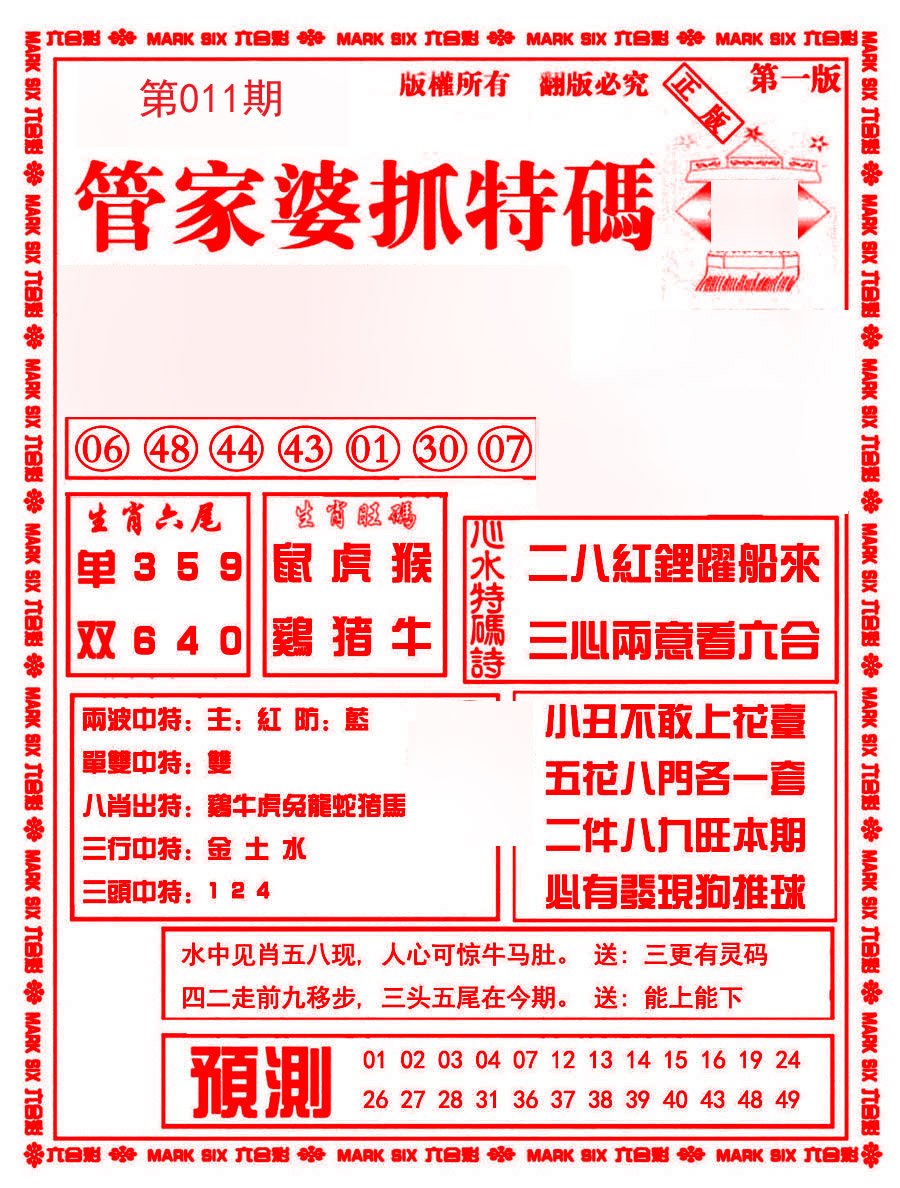 | 003期: ⑥肖 | 牛龙兔鸡鼠猪 | 马24中 |