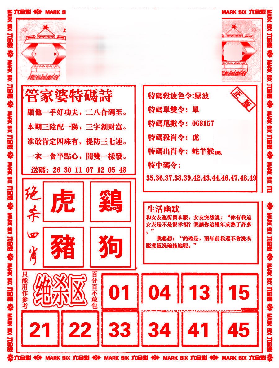 | 004期: ⑥肖 | 鼠狗羊蛇龙鸡 | 猪07中 |