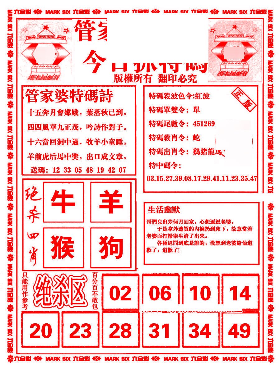 | 009期: ⑥肖 | 兔鸡龙鼠马牛 | 羊47中 |
